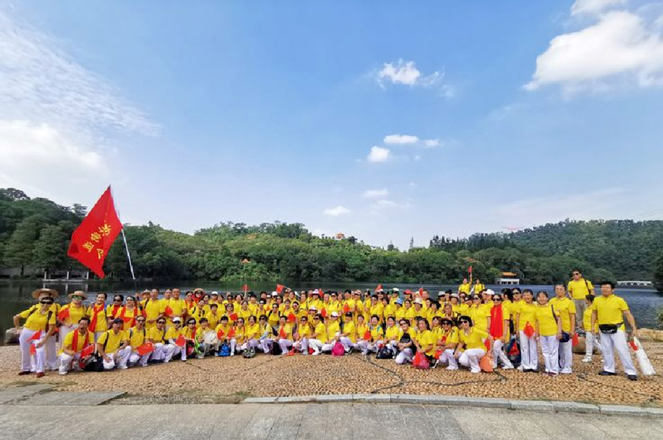 深圳的十月,秋高气爽,风和日丽,气候宜人。十月二十五日华强北街道老年协会组织所属社区的老年协会会员来到美丽的仙湖植物园走绿道。近两百位老年协会会员身着统一服装,手举国旗,排着整齐的三路纵队,在老年协会会长带领下,在会旗的引领下,行进在林荫路上,呼吸着林间的新鲜空气,高歌《我和我的祖国》、《我们走在大路上》、《我的祖国》等歌曲,歌声此起彼伏。 全体老年朋友们以这样的方式抒发着对伟大祖国的热爱和对美好生活的向往。