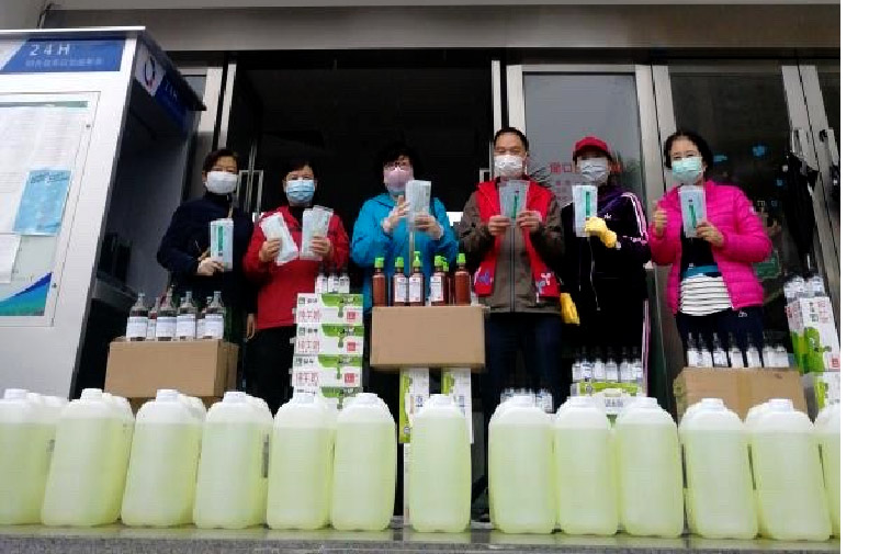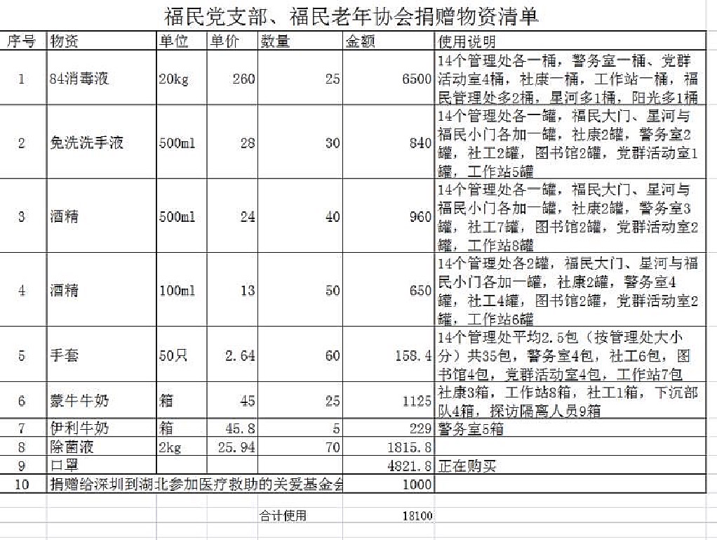辞旧迎新日,厄运突降临!新冠病毒短时间内在各地肆虐爆发,在严峻的疫情面前,福田街道福民社区老年人协会于淑梅会长等积极响应国家的号召,讲忠诚、尽责任、敢担当,配合社区党委在这场没有硝烟的残酷战“疫”中,把社区防控作为重中之重,笃定大爱、且将责任深植于心,首先带领福民住宅小区联合党支部党员、老协会员构筑社区防控疫情“铜墙铁壁”,在做好自我保护的同时,每天通过微信或电话与社区党委书记、老协会员进行沟通,一方面鼓励长者从心理上打赢防疫仗,一方面设立抗击疫情志愿者小组:由身体健康的党员、会员组成。并通过老年人协会微信群发起了党员、会员“同舟共济,打败疫情”的捐款倡议,凝聚长者们共克时艰的正能量,共有120余名党员、会员捐款18100元;于会长和志愿者小组成员将捐款落实为物资:口罩、酒精消毒液、牛奶等防护用品送往福民社区14个物管委、党群服务中心、志愿者站点以及警务室、社康中心。协助社区党群服务中心每天轮流帮助居家隔离的人员买菜、倒垃圾;为社区各要道来往人员测体温等。
