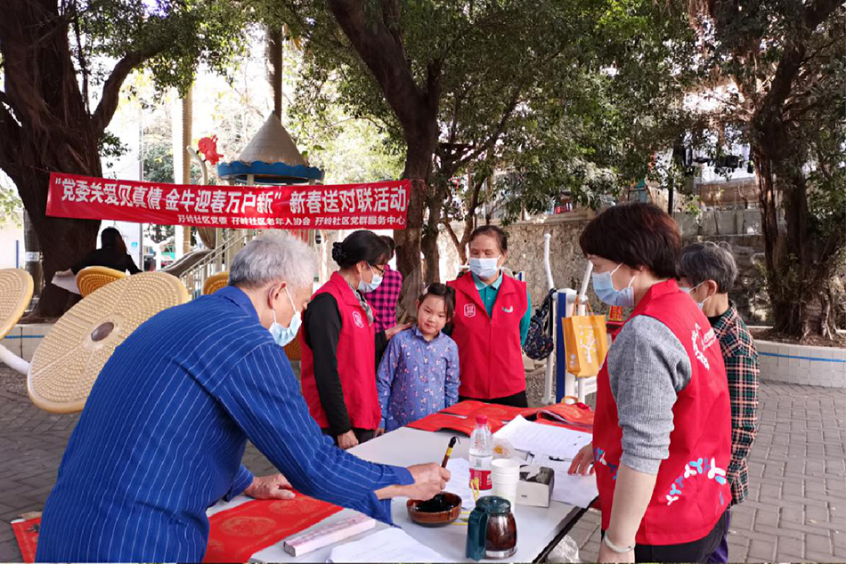 为了让辖区居民过个幸福年,充分感受到党委和社区的关爱和温暖,营造喜庆、温馨的新春节日氛围。1月30日、2月3日在孖岭社区党委的指导下,孖岭社区老年人协会、社区党群服务中心分别在汇龙花园、艺丰花园A区小公园开展“党委关爱见真情 金牛迎春万户新”新春送对联活动,孖岭社区老年人协会特邀四位书法老师为社区居民书写新春祝福,将新年的美好祝福送到居民身边。