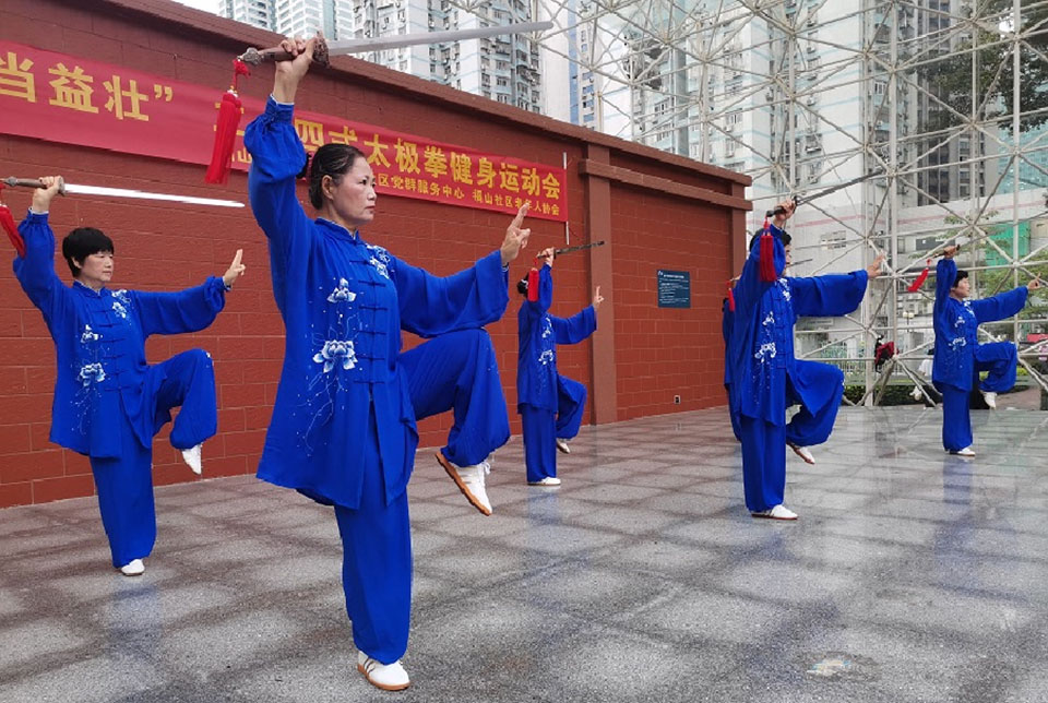 全场活动共分六个部分,健身操、太极剑、健身舞、武当、走秀,最后有老协会员组成方队展演中华民族的传统武术《24式太式极拳》,把运动会推向高潮。