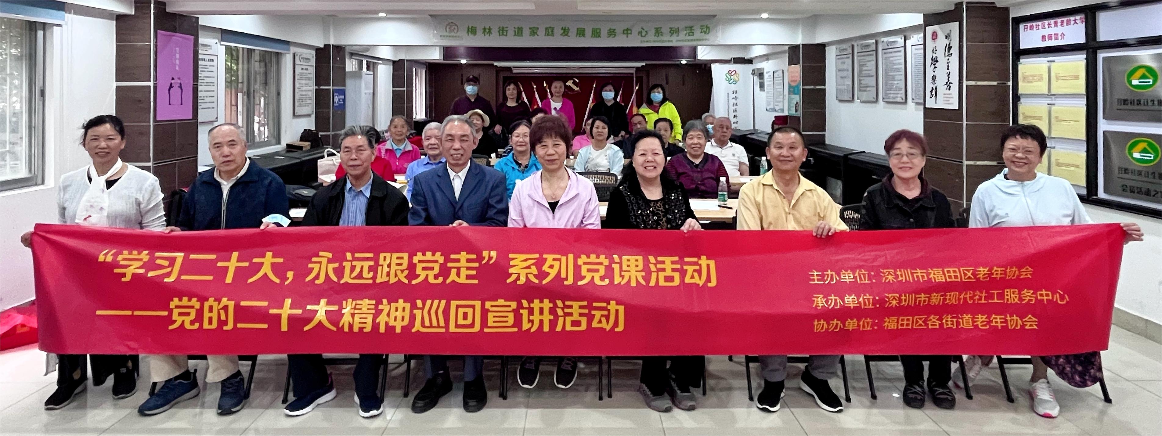梅林街道是此次党的二十大精神巡回宣讲活动的第八站,梅林街道老年协会会长吴海燕出席活动,福田区“幸福银龄”讲师团成员屈贵平为大家授课。