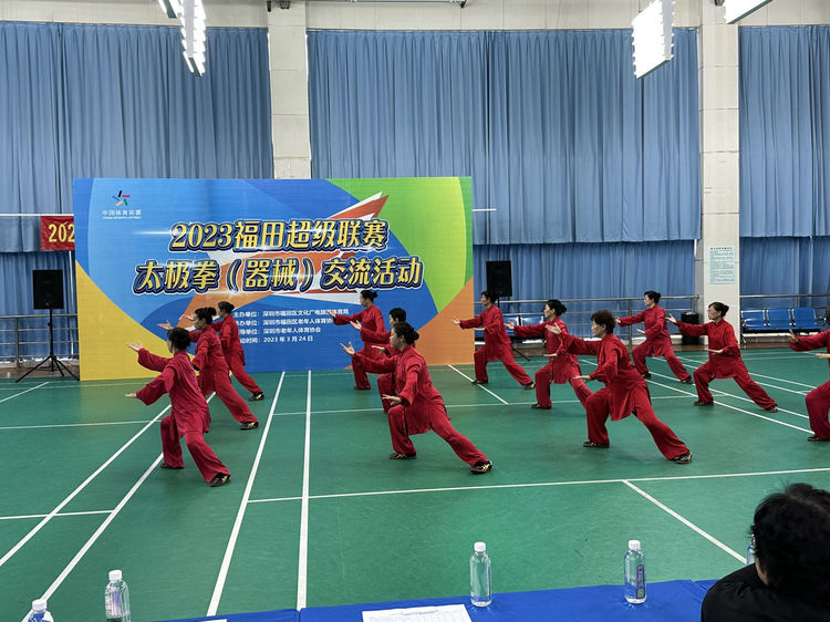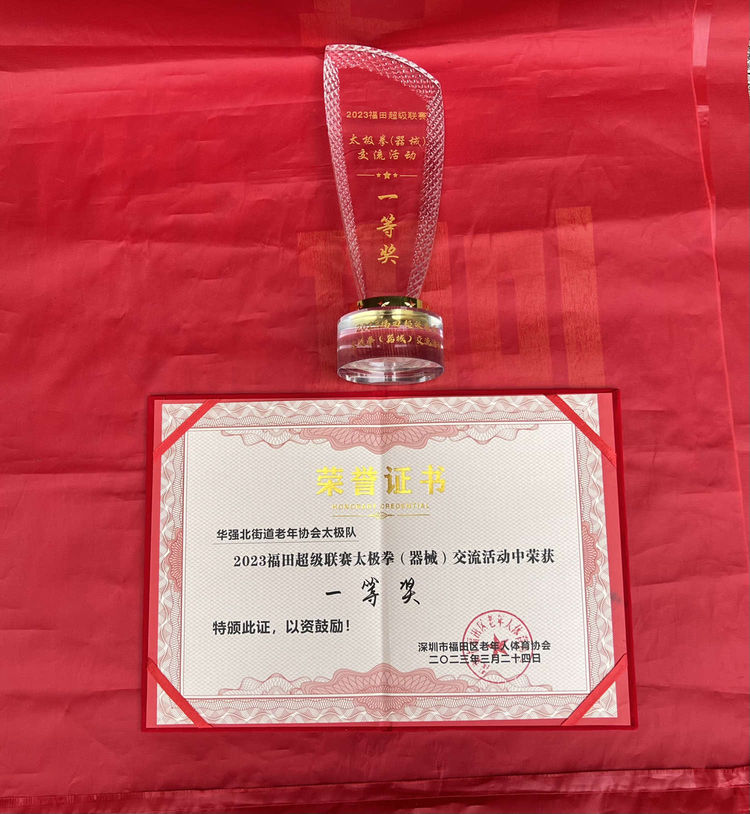 2023年3月24日,福田超级联赛之太极拳(器械)交流赛,在梅林文体中心二楼羽毛球场馆隆重举办。华强北街道老年协会太极队的参赛队员充分发扬"团结、拼搏、进取"的团队精神,一项一项比,一分一分拿,经过激烈角逐,太极队参加的两个项目均获大奖,其中四十二式太极剑以全场最高分9.0的优异成绩,勇夺冠军的奖杯,杨式太极拳四十式也获得二等奖的好成绩。