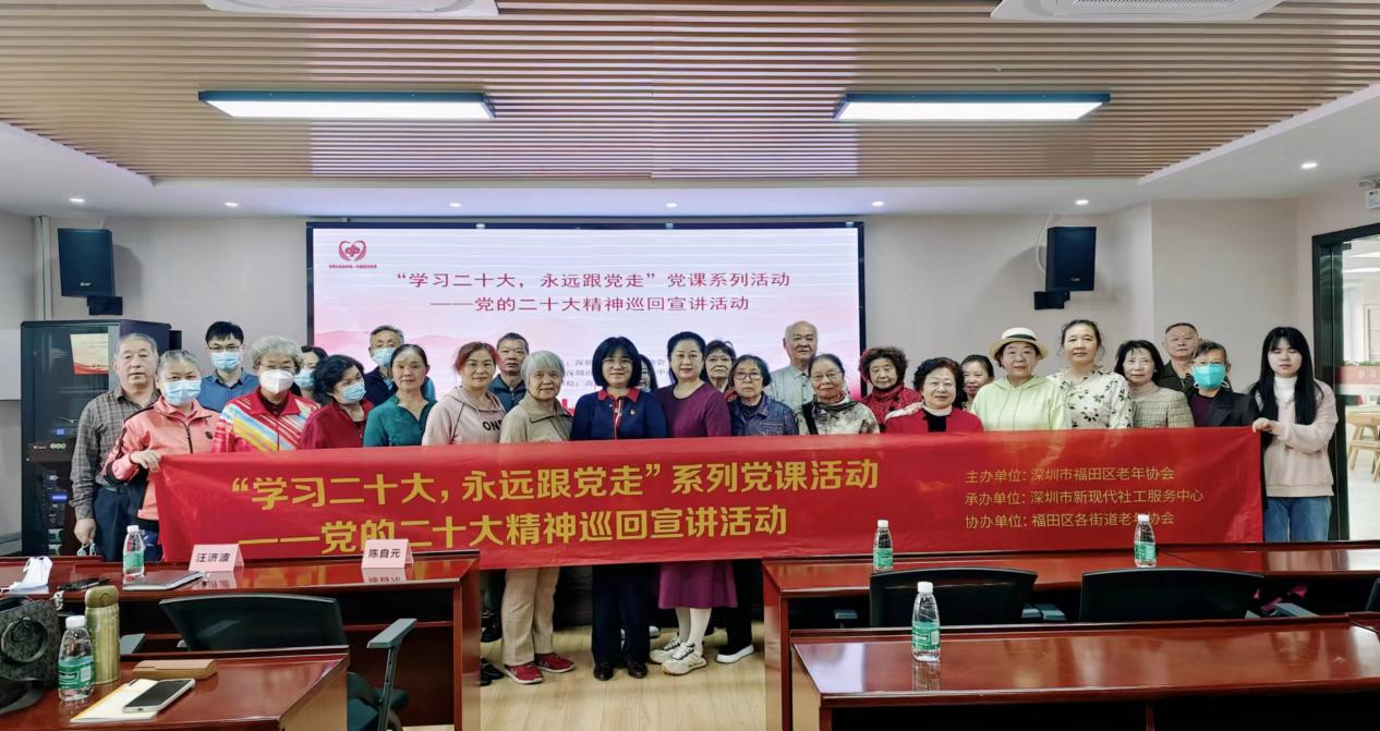 为深入学习宣传贯彻党的二十大精神,切实把全区老年群众的思想和行动统一到党的二十大精神确定的总体要求和部署上来,近期,由深圳市福田区老年协会主办、深圳市新现代社工服务中心承办的“学习二十大,永远跟党走”党课系列活动——党的二十大精神巡回宣讲顺利举行,福田区“幸福银龄”讲师团先后走进福田区10个街道,面向老年群体,开展了10场面对面、互动性的宣讲交流,福田区各街道、社区老协干部,老年群众代表等300余人参加。