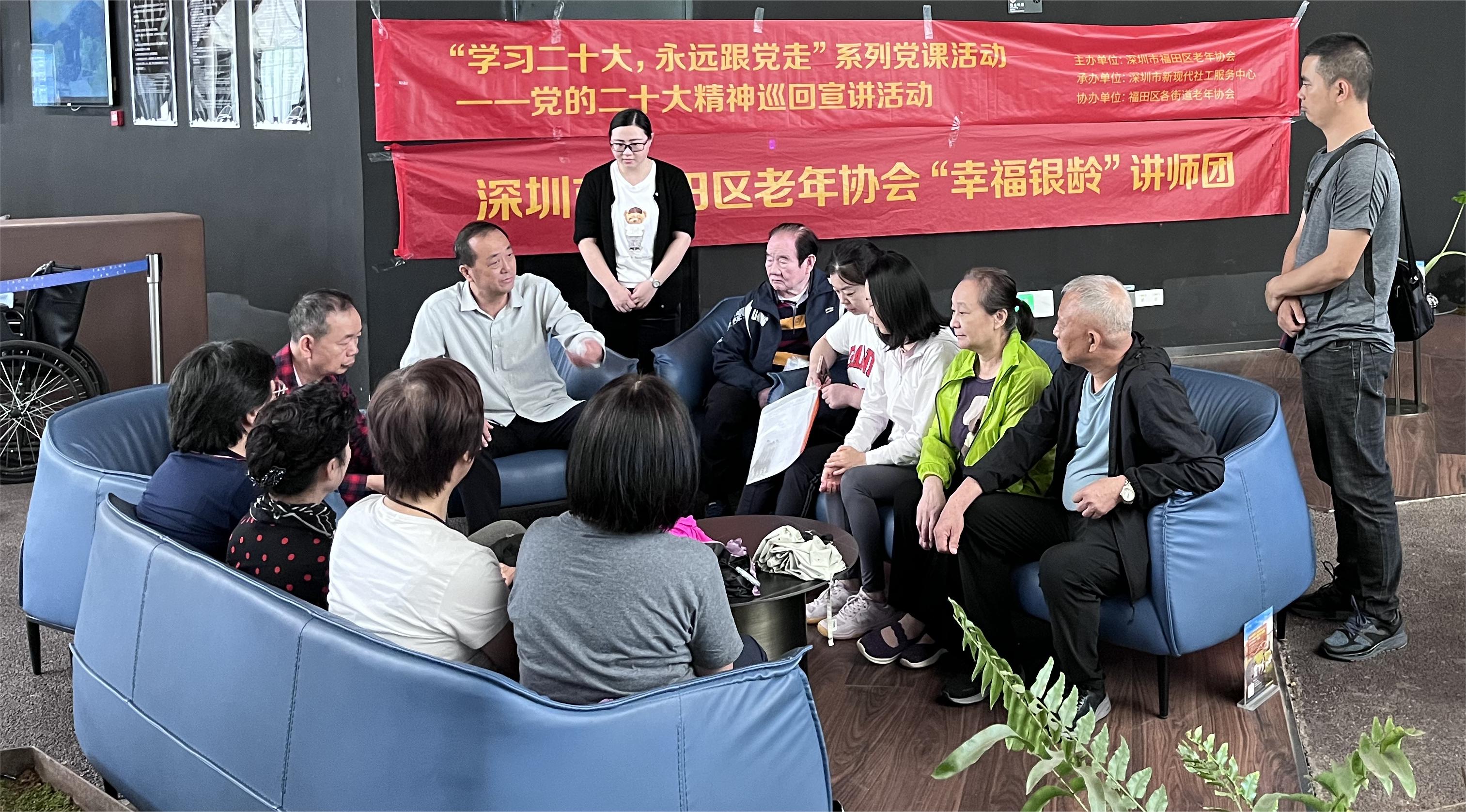 自2023年2月至今,福田区老年协会陆续开展“党的二十大精神巡回宣讲”、“积极老龄观、健康老龄化”主题讲座暨参访两轮主题活动。活动组织福田区10余位退休干部、专家学者、党务工作者等组成“幸福银龄”讲师团,先后走进福田区10个街道,以理论宣讲、专题讲座、红色参访等多种形式,为福田区老年人普及党的好政策,传递党的好声音。