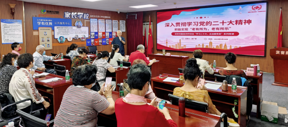 党的二十大报告提出,实施积极应对人口老龄化国家战略,进一步满足广大老年人精神文化需求,让老年人老有所学、老有所为、老有所乐。为持续深入贯彻学习党的二十大精神,推动福田区老年党员干部群众深刻领会党的二十大的重大意义、丰富内涵、核心要义和实践要求,5月16日上午,由福田区老年协会主办、深圳市新现代社工服务中心承办的“学习二十大,永远跟党走”党课系列活动第二轮宣讲——“积极老龄观、健康老龄化”主题讲座走进福保街道,吸引辖区30余名老年长者参加。
