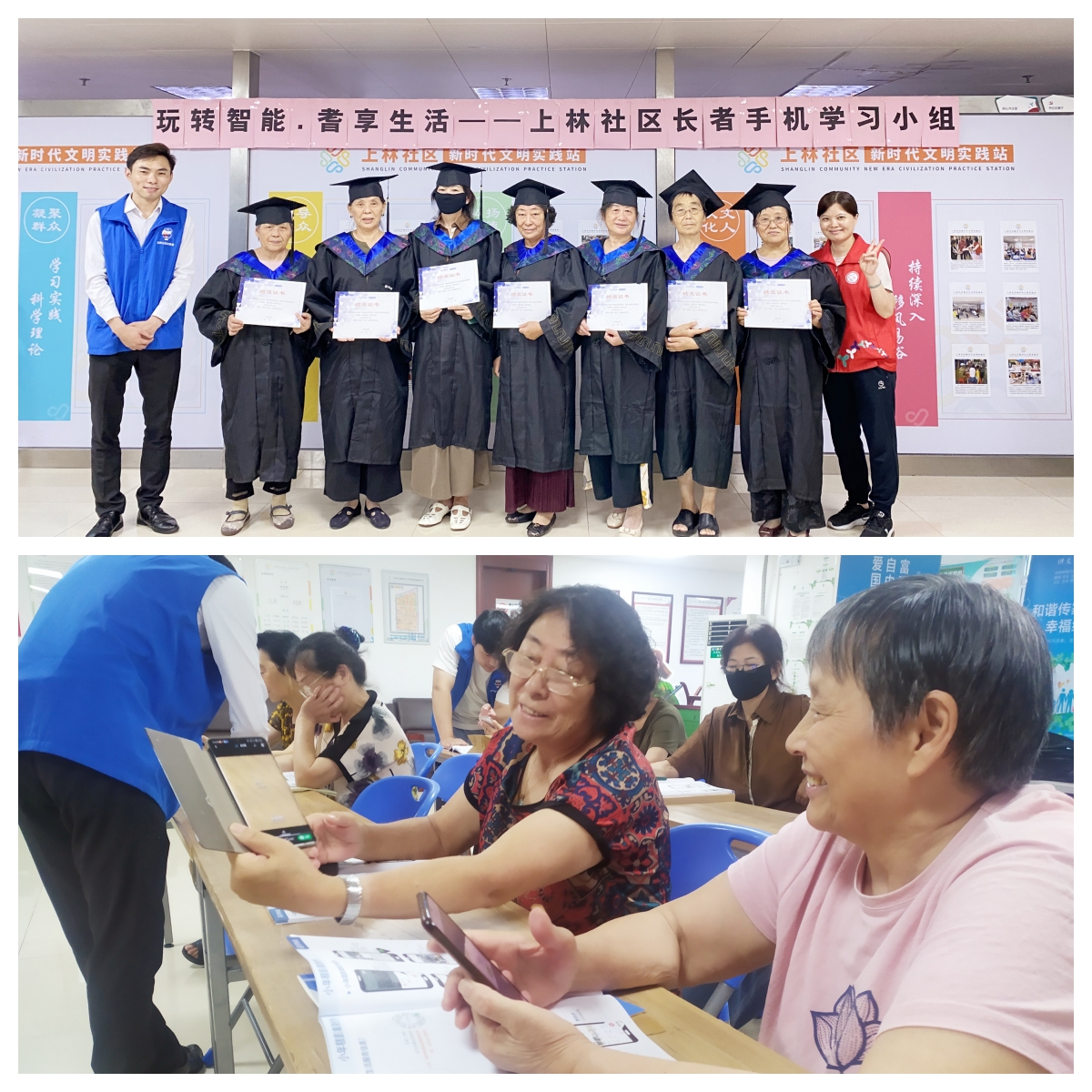 7月14日,上林社区党群服务中心联合贝壳公益举行了一场别开生面的“毕业典礼”,老人们穿上学士服,领取结业证书,正式从“玩转智能 耆享生活”智能手机系列课程毕业了。