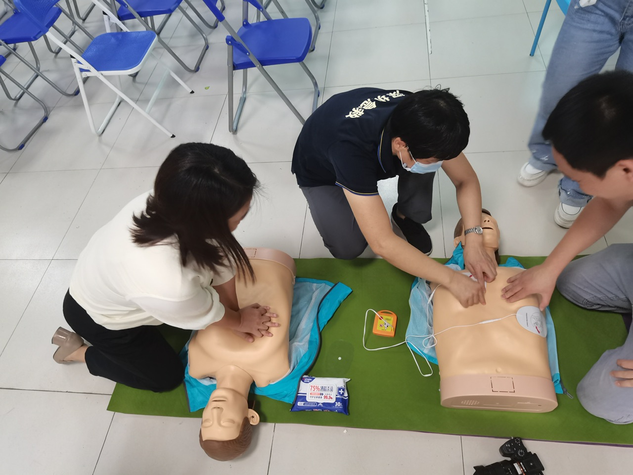 导师吴荣导师先后介绍了成功营救的关键要素、如何识别心脏骤停、心脏骤停的症状、心肺复苏的概念和成功率与时间的关系等。最后,重点讲解心肺复苏(CPR)的关键步骤:胸外心肺按压、开放气道、人工呼吸等,并介绍了AED除颤仪的使用方法。另外,吴老师还用视频讲解、现场手把手示范的方式生动地进行实操演练。学员们纷纷上前练习,取得良好的效果。