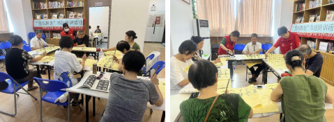 要点,详细地讲解了如何正确握笔、运笔,以及书写时的姿势调整,分享自己的书法心得与技巧。随后,老师们为大家演示了书写方法,并分享了自己在书写过程中的心得体会。在两位老师的指导下,书法爱好者们开始了自己的书法练习,认真书写每一个笔划和字体,不断揣摩笔画之间的韵味。老师们则在一旁悉心指导,鼓励他们大胆落笔、不断进步,活动现场氛围融洽。